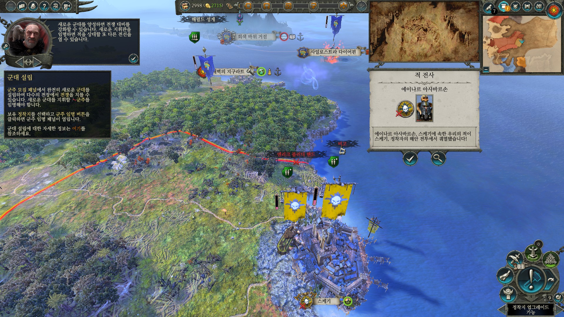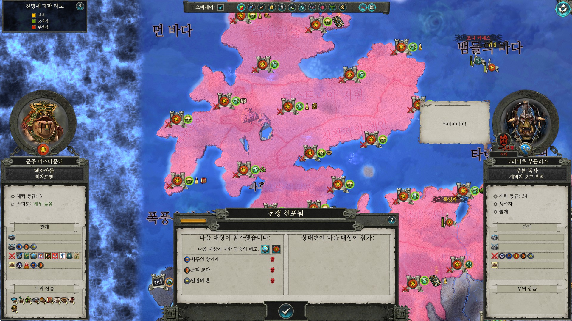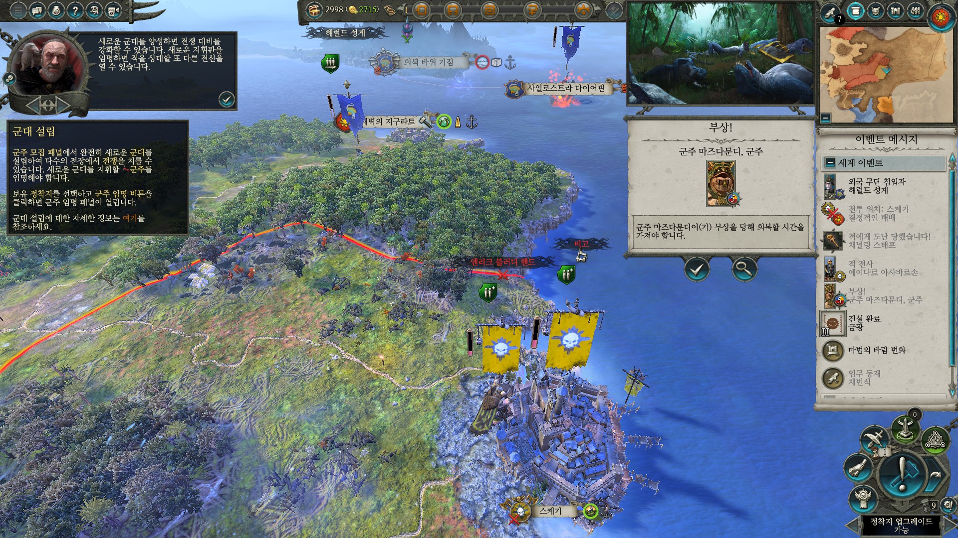 계속 한계에 부딪혔던 처음 몇번의 전투를 리자드맨과 함께 수월하게 넘기고 났더니 뽕이 차오른다. 사실 난이도를 쉬움으로 두었음에도 익숙하지 않은 UI와 토탈워라는 게임 특유의 시스템 때문에 전투가 엄청 큰 벽으로 다가왔다. 내정도 다른 전략시뮬레이션 게임에 비해서는 단순하다고 하지만 플레이어가 반드시 선택 해야하는 부분이 있어서 마냥 쉽다고는 할 수 없었다. 내정 자체가 게임의 한 재미를 담당한다기 보다는 전투의 준비 단계같은 느낌이라 전투를 잘 모르면 자연스럽게 내정도 어려워진다. 단순하지만 어려운 내정, 복잡하고 어려운 전투가 나를 괴롭혔지만 공룡탄공룡님이 와서 그 괴로움이 끝난 것이다.