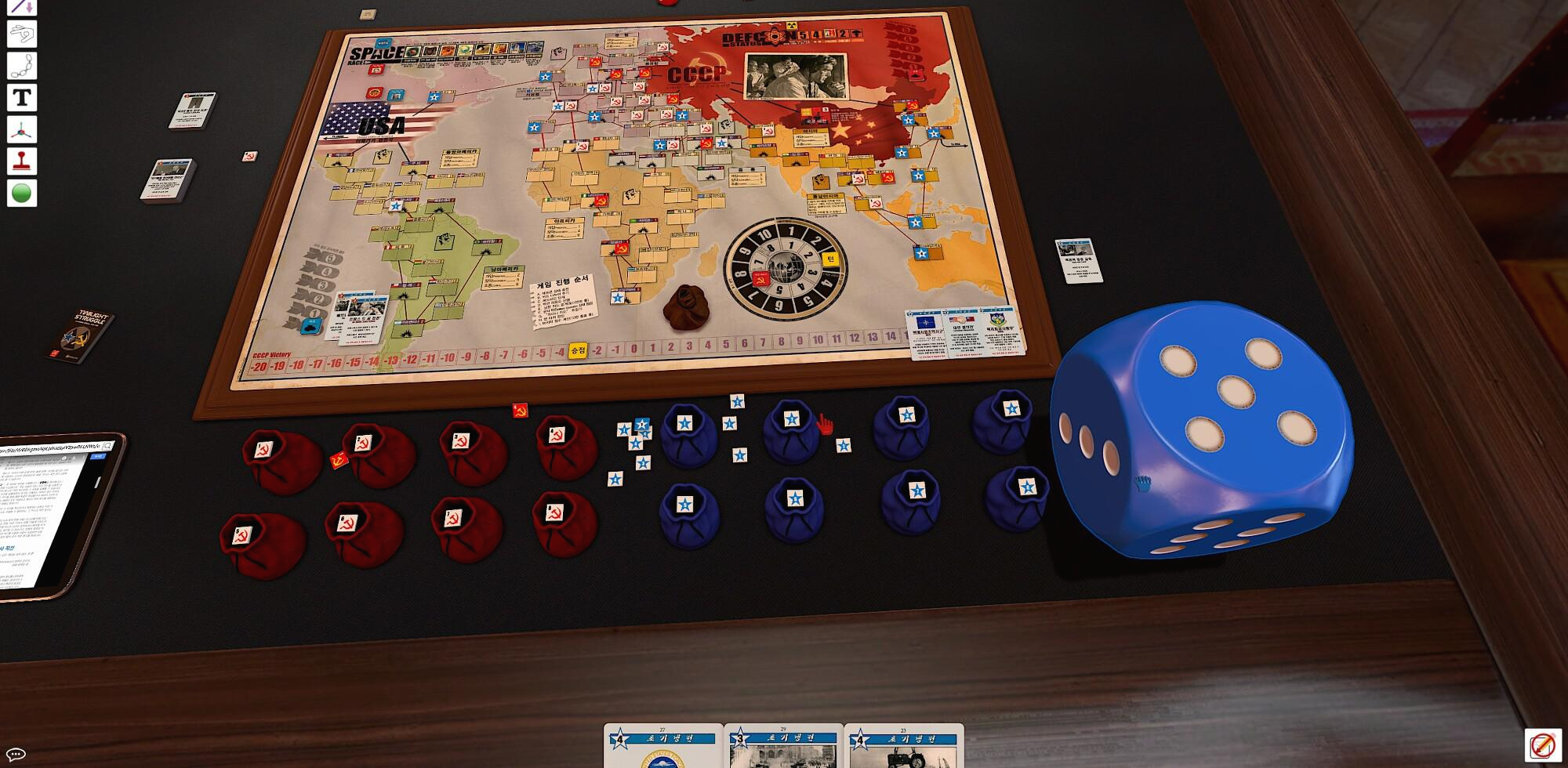냉전시대 배경의 분위기가 마음에 들었다. 손에 쥔 카드의 사건이나 포인트를 이용해서 승리를 취하거나 상대가 자폭하게 만드는 전략게임이다. 주사위 요소도 있고 땅따먹기와 같은 상대 공격 요소도 있기 때문에 하다 보면 주먹을 불끈 쥐게 한다. 다만 문제는 룰 설명이 어렵다. 배경 분위기도 호오가 갈리는 것 같다. 안 그래도 어려워보이는데 게임 배경까지 무거워 보여서 관심을 가지기 어렵다. 실제로 플레이 시간도 1시간은 훌쩍 넘겨서 결코 가벼운 게임이라고 볼 수 없다. 1:1 대결 게임이다 보니 자연스럽게 플레이하면서 튜토리얼을 하기도 어렵기 때문에 아예 첫 판은 튜토리얼 판으로 하는 것이 시간을 절약하는 길이다. 한창 게임 중반에 자기 손패를 보여주면서 적인 상대에게 룰을 물어보면 갑자기 게임의 맥이 탁 풀린다. 둘 다 수준이 올라오면 냉전을 넘어 열전을 펼칠 수 있다.