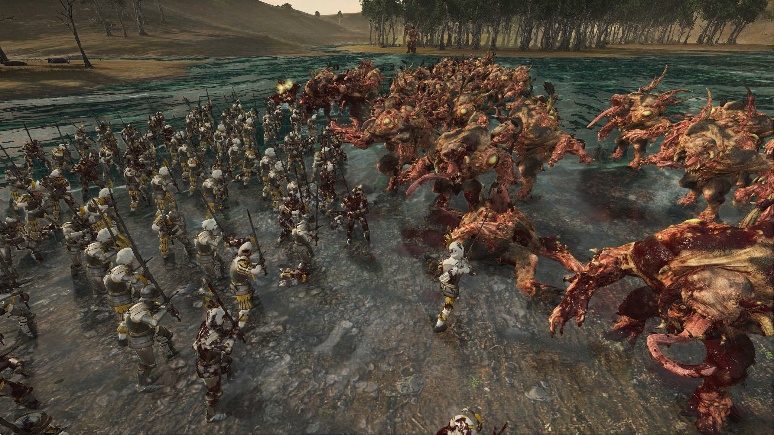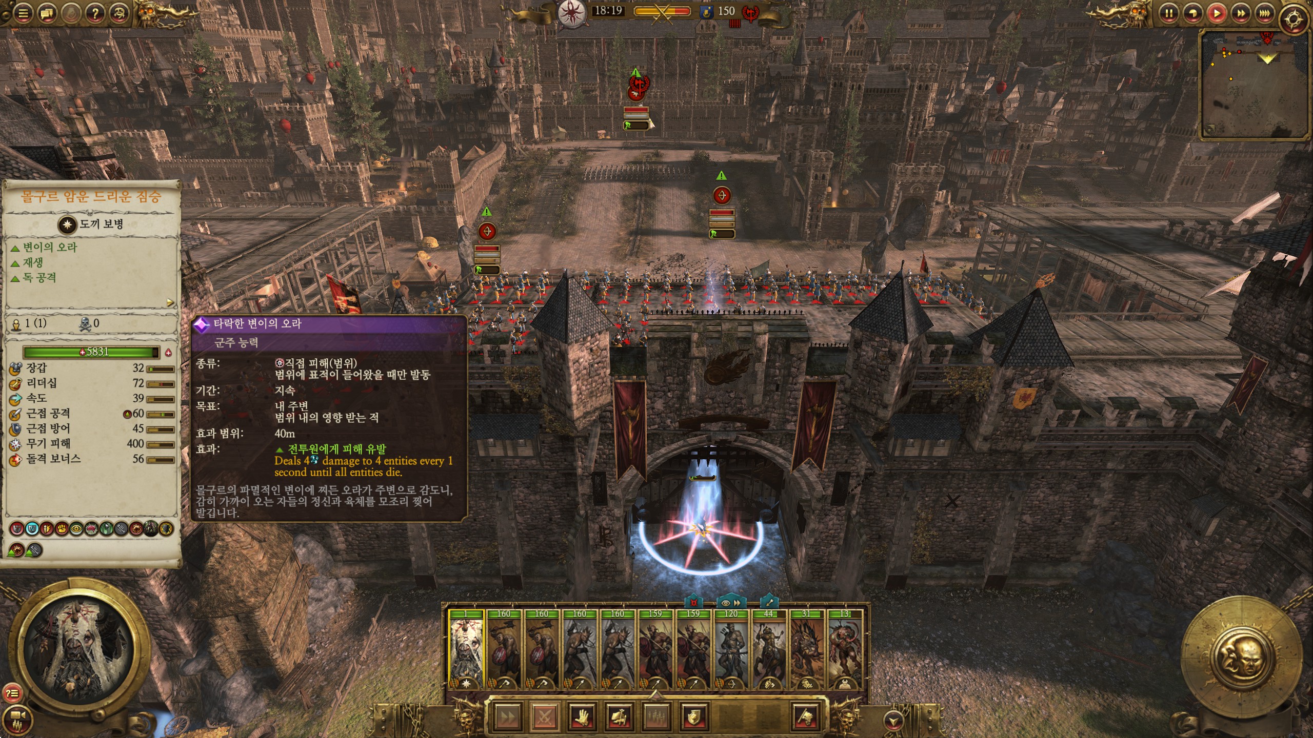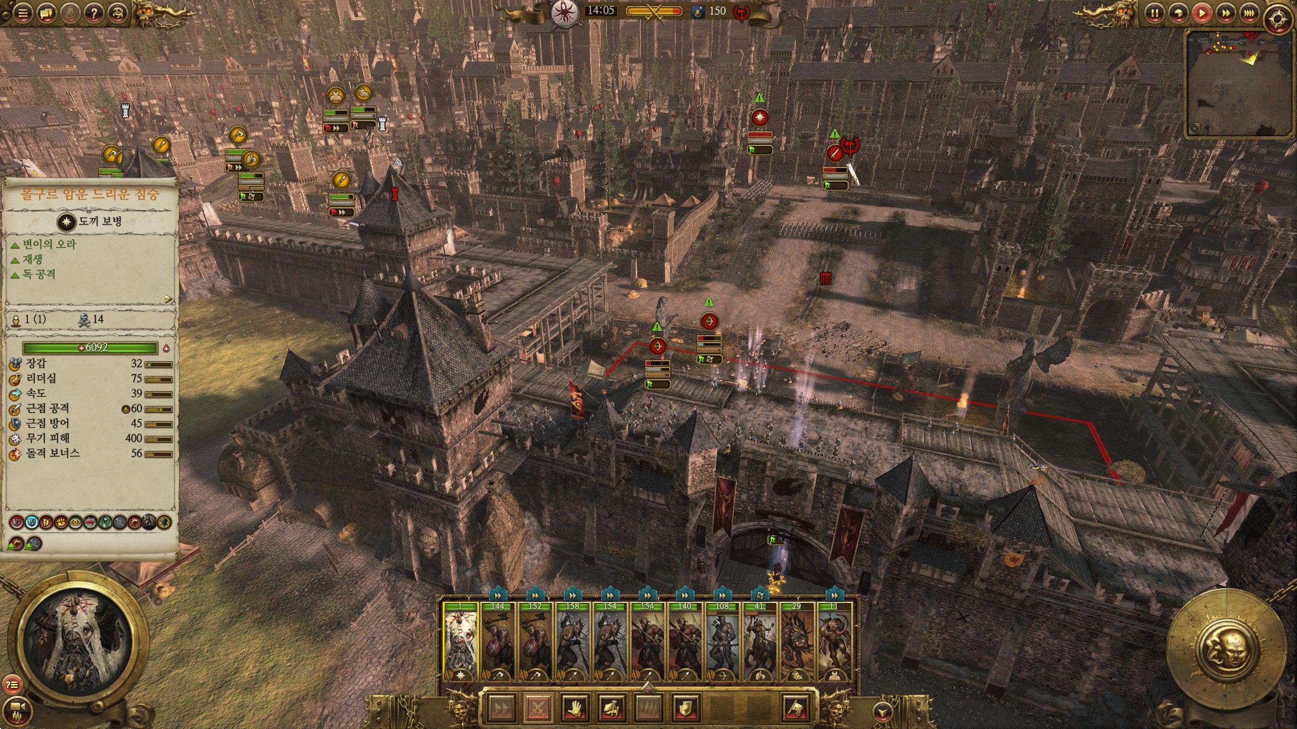 스케이븐? 쥐떼 물량전을 기대했다. 고기방패들이 끝없이 쏟아지고 상대 고급 병종은 썰다썰다 지쳐서 활력이 떨어진 채로 평소라면 상대도 안됐을 쥐떼에게 결국 박살나는 그런 그림을 꿈꿨지만 그놈의 추가군단 유지비 패널티가 너무 커서 저티어 병종이라 하더라도 군단을 함부로 꾸리기가 어려웠고 물량전은 커녕 아주 미세한 컨트롤을 필요로 하는 화기반, 포병전이 주를 이루었다. 물론 재미는 있었지만 쉽지는 않았다.