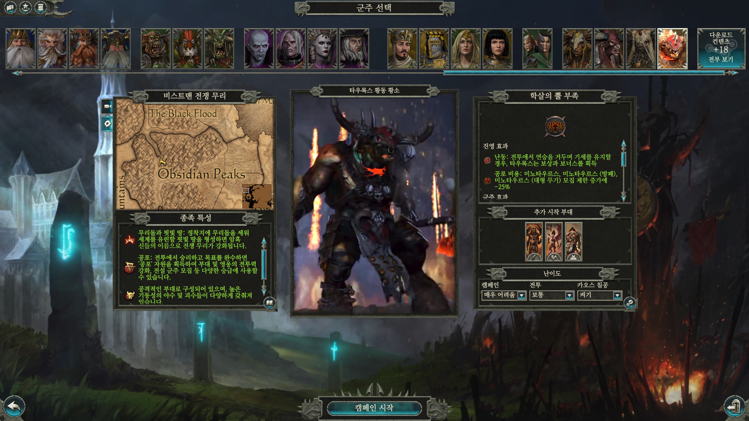 군주가 개성 넘치고 좋다. 1편의 DLC까지 구매했으면 전설군주를 다 뽑아서 써볼 수 있다. 다른 종족의 경우에는 AI 전설군주를 영입하기가 쉬운 일이 아니지만 비스트맨은 공포만 잘 모아서 구매하면 된다. 각각 특징이 뚜렷하고 지원하는 병종에도 구분이 있어서 모두 운용하는 데 부담이 없다. 외눈 카즈라크에게는 언고어와 전차를 맡기고 몰구르에게는 역겨운 카오스산물을 맡기고 황동황소 타우록스에게는 미노타우르스를 맡기고 말라고어에게는 아무거나 쥐어주고 여기저기 스펠 날려대면 다양한 플레이 방식을 맛볼 수 있다. 아직까지 햄탈워를 많이 플레이해본 것은 아니지만 군주 개인의 능력도 다른 종족의 군주에 비해 특색이 있다. 개인적으로는 말라고어가 매우 빠른 속도로 미친듯이 날아다니면서 마법을 뿌려대고 만만한놈은 히어로 슈퍼랜딩으로 응징해주는 것이 인상깊었고 몰구르의 괴랄한 사격저항과 도트데미지 주는 능력이 끌렸다. 그리고 별도로 UI표시가 없어서 몰랐는데 무려 케인의 검도 들 수 있어서 깜짝 놀랐다. 황동황소 타우록스는 안그래도 무쌍인데 케인의 검까지 쥐어 주니 시원한 플레이에 감칠맛까지 더해진 느낌이었다.